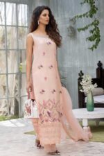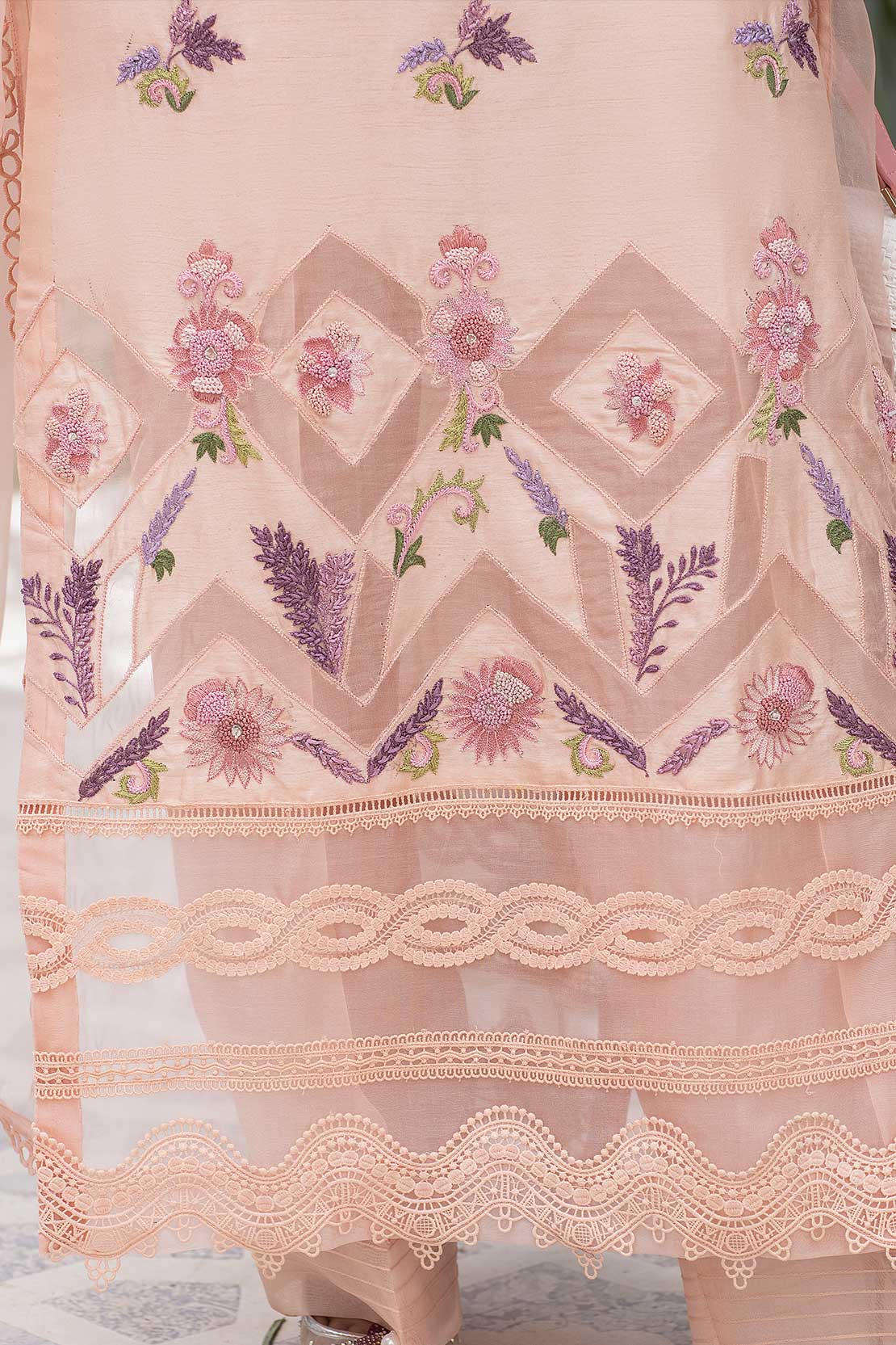 Front of shirt is embroidered with single resham beautiful boarder with hand work. Neckline embellished with kat Dana. Shirt boarder is of organza with different beautiful laces on it.